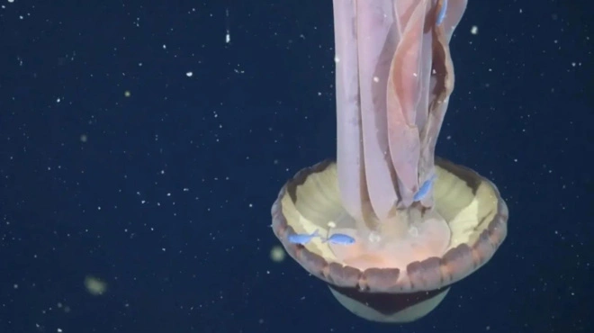 Ομάδα επιστημόνων από το Ωκεανογραφικό Ινστιτούτο Schmidt εξερευνούσε με υποβρύχια κάμερα ένα θαλάσσιο φαράγγι σε μεγάλο βάθος όπου δεν φτάνει το φως του ήλιου. Τότε μπροστά από την κάμερα πέρασε η μέδουσα – γίγας, που ανήκει στο σπάνιο είδος Stygiomedusa gigantea, ή γιγάντια μέδουσα – φάντασμα.