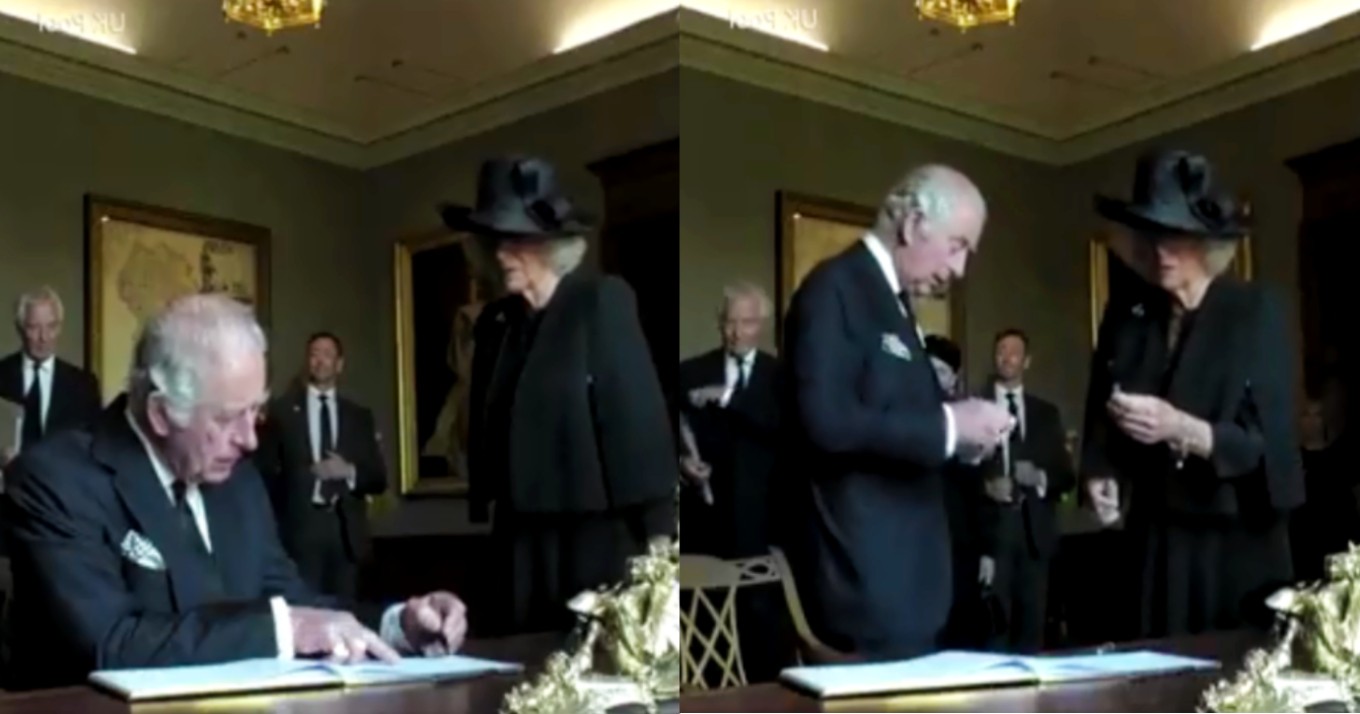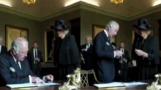 Σε αυτό, ο διάδοχος της Ελισάβετ βρίσκεται στο κάστρο του Hillsborough, στην Βόρεια Ιρλανδία και επιχειρεί να υπογράψει το σχετικό βιβλίο που υπάρχει εκεί.