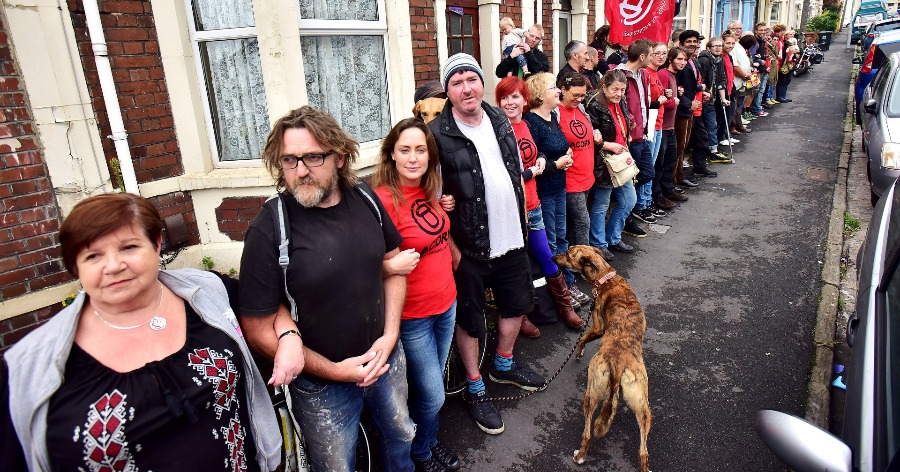 Οι κάτοικοι και ακτιβιστές έφτιαξαν μια ανθρώπινη αλυσίδα για να αποτρέψουν την είσοδο των δικαστικών επιμελητών στο ακίνητο. Αυτό έγινε μετά την καταγγελία για έξωση. Περίπου 30 άτομα στάθηκαν δίπλα – δίπλα, κλείνοντας την είσοδο στο νοικιασμένο σπίτι στο Μπρίστολ. Σύμφωνα με την Daily Mail, ένα νεόνυμφο ζευγάρι που ζει απέναντι έκανε το κλίμα λίγο πιο γιορτινό. Αυτό, διότι μοίρασε κομμάτια τούρτας από το γάμο τους.