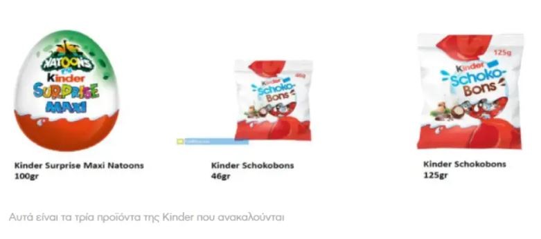 “Ο ΕΦΕΤ στο πλαίσιο της συνεργασίας του με την Ευρωπαϊκή Επιτροπή και όσον αφορά στην προληπτική ανάκληση προϊόντων Kinder, λόγω πιθανής παρουσίας σαλμονέλας, ενημερώνει ότι η εν λόγω ανάκληση επεκτείνεται πλέον στο σύνολο των προϊόντων Kinder Schokobons και Kinder Surprise Maxi των 100gr , ανεξαρτήτου παρτίδας. Η εν λόγω εξέλιξη οφείλεται στην αδυναμία της παραγωγού επιχείρησης «Ferrero Ardennes”, που εδρεύει στο Βέλγιο, να διασφαλίσει την ασφάλειά τους.