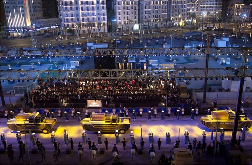 Είκοσι δύο άρματα, που μετέφεραν τις μούμιες βασιλιάδων και βασιλισσών της αρχαίας Αιγύπτου, παρέλασαν χθες το βράδυ στους δρόμους του Καΐρου, σε ένα φαραωνικό θέαμα, για να πάνε στο καινούριο «σπίτι» τους, το Εθνικό Μουσείο Αιγυπτιακού Πολιτισμού (NMEC).