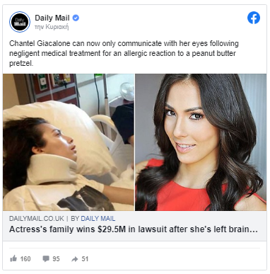 Η άτυχη κοπέλα υπέστη εγκεφαλική παράλυση μετά από σοβαρή αλλεργική αντίδραση στο πρέτζελ. Το περιστατικό που άλλαξε για πάντα τη ζωή της Chantel Giacalone σημειώθηκε στις 20 Φεβρουαρίου 2013. Το 27χρονο τότε μοντέλο συμμετείχε σε μια επίδειξη μόδας και μια φίλη της αγόρασε παγωμένο γιαούρτι και έβαλε πάνω ένα μικρό πρέτζελ.
