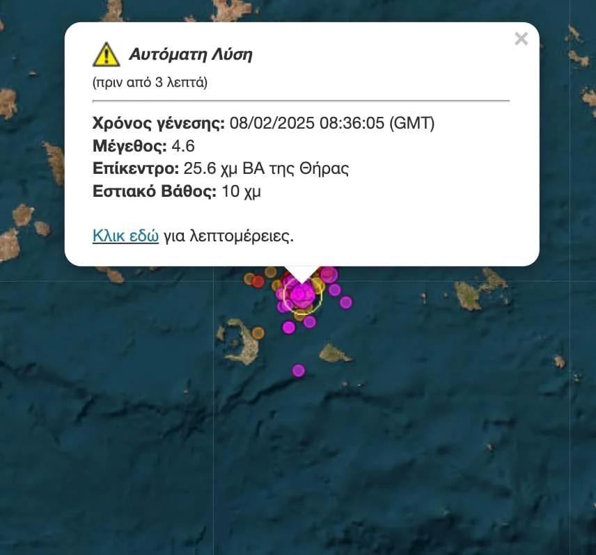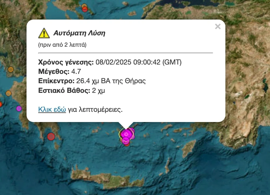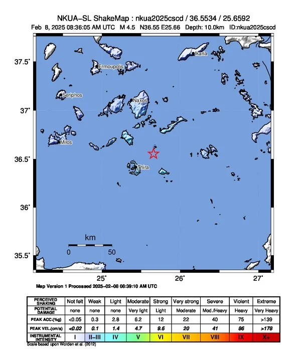 Ο σεισμός έχει επίκεντρο 26,4 χιλιόμετρα βορειοανατολικά της Θήρα με εστιακό βάθος 2 χιλιόμετρα.