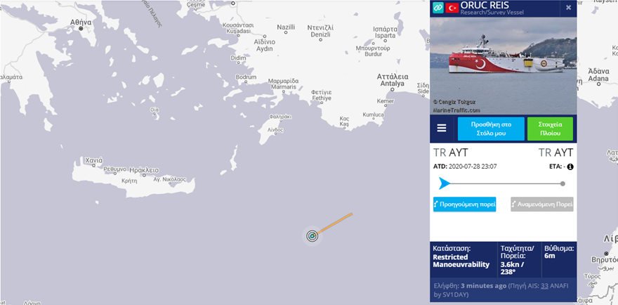 Τα καλώδια του σεισμογραφικού παραμένουν ποντισμένα, ωστόσο σύμφωνα με εκτιμήσεις της ελληνικής πλευράς, δεν μπορεί να κάνει έρευνες λόγω του θορύβου που προκαλούν τα πλοία που βρίσκονται κοντά του (ελληνικά και τουρκικά). Το σύνολο σχεδόν του ελληνικού στόλου έχει παραταχθεί κοντά στο τουρκικό ερευνητικό σκάφος Oruc Reis. Αρκετές μονάδες του Πολεμικού Ναυτικού παρακολουθούν λεπτό προς λεπτό τις κινήσεις του, εκπέμποντας κάθε 15 λεπτά μήνυμα μέσω ασύρματου ότι το τουρκικό ερευνητικό σκάφος βρίσκεται παρανόμως εντός ελληνικής υφαλοκρηπίδας και καλώντας το να αποχωρήσει από αυτή.