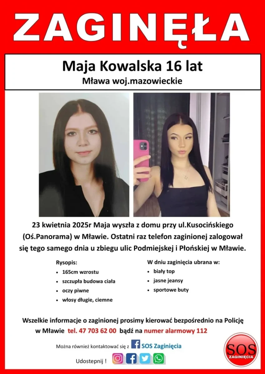 Σύμφωνα με την εφημερίδα Fakt, αναλύθηκαν, μεταξύ άλλων, καταγραφές από κάμερες ασφαλείας της πόλης, και ερευνήθηκαν οι περιοχές των οδών Podmiejska, Płońska, Szreńska και γειτονικών οικοπέδων. Παράλληλα, ελέγχθηκαν περιοχές του κοντινού σιδηροδρομικού σταθμού, καθώς και οι διαδρομές που οδηγούν προς το νοτιοανατολικό τμήμα της Μλάβα. Η σορός της 16χρονης, εντοπίστηκε μία εβδομάδα αργότερα, την Πέμπτη (01/05), σε σημείο που είχαν ήδη ερευνήσει οι Αρχές. «Το σώμα της βρέθηκε έξω, όχι σε κτίριο. Βρισκόταν σε θάμνους κοντά στις σιδηροδρομικές γραμμές» λέει, η επιθεωρήτρια Καταρζίνα Κουχάρσκα, εκπρόσωπος της Περιφερειακής Αστυνομικής Διεύθυνσης με έδρα το Ράντομ.