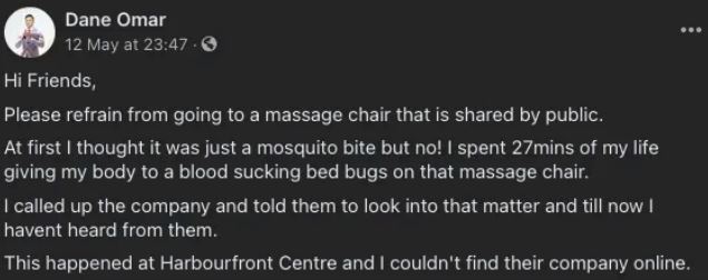 Σύμφωνα με τη δημοσίευση που είχε κοινοποιήσει, είχε περάσει 27 λεπτά στην καρέκλα μασάζ, αλλά όταν ανακάλυψε ότι υπήρχαν εκεί ζωύφια ήταν πολύ αργά.