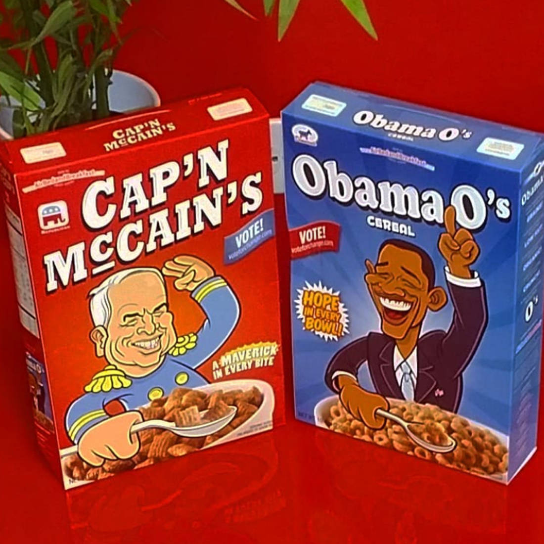 Απελπισμένοι καθώς ήταν σκέφτηκαν να στραφούν στην αγορά του πρωινού. Έτσι, έβαλαν σε εφαρμογή την παράτολμη, αλλά απλή ιδέα: ο Τσέσκι παρήγγειλε χίλια κουτιά δημητριακών με λογότυπα Obama O’s (τα όμικρον του Μπάρακ Ομπάμα) και Captain McCain (στρατηγός Μακέιν), χρησιμοποιώντας τα ονόματα των τότε δύο υποψηφίων για την αμερικανική προεδρία. Και ξεκίνησαν να τα πουλάνε έναντι του εξωφρενικού για το προϊόν, ποσού των 40 δολαρίων το κουτί, προωθώντας τα ως «περιορισμένη έκδοση».