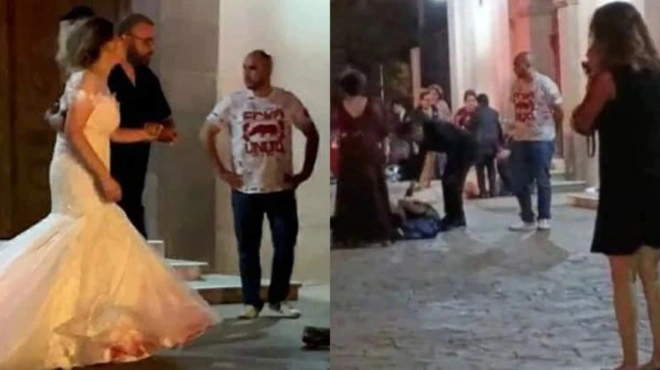 Βίντεο δείχνουν την σύζυγό του να απομακρύνεται από την εκκλησία σε κατάσταση σοκ, με το λευκό νυφικό της να έχει βαφτεί με αίμα.
