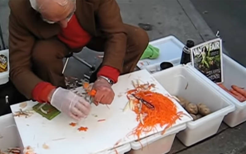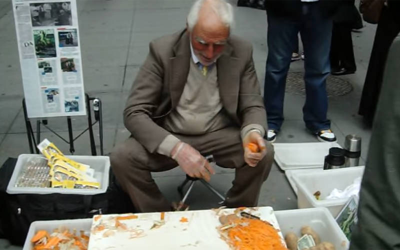 Και το σόου του ήταν τόσο αχτύπητο που πλήθος κόσμου μαζευόταν για να δει τα θαυματάκια που έκανε με τον ξεφλουδιστή ανά χείρας. Τρία-τέσσερα λεπτά μετά, ποτέ αργότερα, ανακοίνωνε και την προνομιακή τιμή του μαραφετιού του, πάντα με τη χαρακτηριστική βρετανική προφορά του.