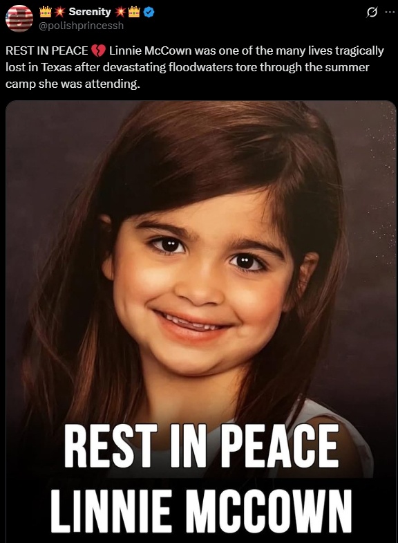 Η μικρή Λίνι Μακάουν ήταν ένα 8χρονο κορίτσι που έχασε τη ζωή της σε μια τραγική πλημμύρα κοντά στο καλοκαιρινό κάμπινγκ Camp Mystic στο Τέξας, όταν ξαφνική καταιγίδα προκάλεσε μοιραίες πλημμύρες.