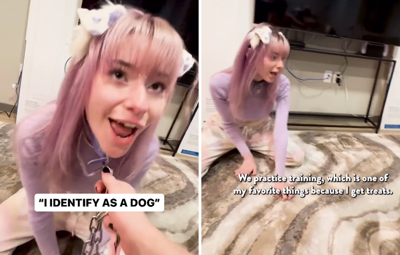 Γυναίκα αρέσκεται να ζει σαν σκύλος. Κοιμάται σε κλουβί, πάει τουαλέτα έξω και τρώει λιχουδιές κάθε φορά που έχει καλή συμπεριφορά.