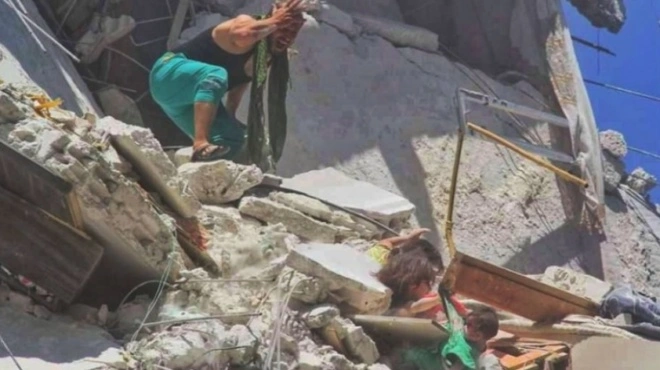 Δημοσιογράφος μαγνητοσκόπησε την περασμένη Τετάρτη τις σκηνές από τον εγκλωβισμό της συγκεκριμένης οικογένειας. Οι επιθέσεις που δέχθηκε το κτήριο από αέρος ήταν ανελέητες. Μάλιστα, όταν κατάλαβε τι γινόταν, παράτησε την κάμερά του. Αμέσως πήγε στο σημείο για να βοηθήσει.