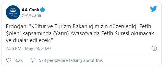Παρά τις πληροφορίες που έκαναν λόγο για ακύρωση της προσευχής έξω από την Αγία Σοφία που προγραμματιζόταν, ο τούρκος πρόεδρος ανακοίνωσε την αλλαγή σχεδίων κατά τη διάρκεια διαγγέλματός του το απόγευμα της Πέμπτης. Όπως χαρακτηριστικά δήλωσε «στο πλαίσιο των εκδηλώσεων για την Άλωσης της Κωνσταντινούπολης που διοργανώνονται από το Υπουργείο Πολιτισμού και Τουρισμού μας, οι προσευχές θα διαβαστούν στην Αγία Σοφία».