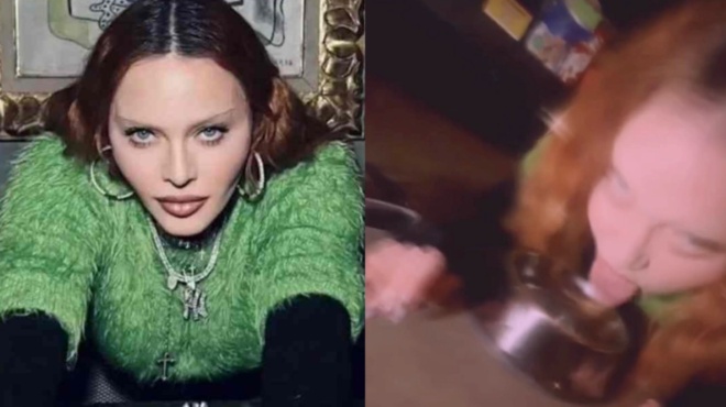 Σε ένα Reel του Instagram που ανέβασε την Τετάρτη, η τραγουδίστρια της «Vogue» συγκέντρωσε πολλές φωτογραφίες φορώντας το πράσινο νέον πουλόβερ της σε συνδυασμό με ένα αστραφτερό σορτς, ένα κολάν και τις ψηλές μπότες. Στο βίντεο φαίνεται να γλύφει νερό από ένα μπολ σκύλου ενώ ποζάρει σεξουαλικά με διάφορα αντικείμενα, που έβρισκε μπροστά της στο σπίτι της.