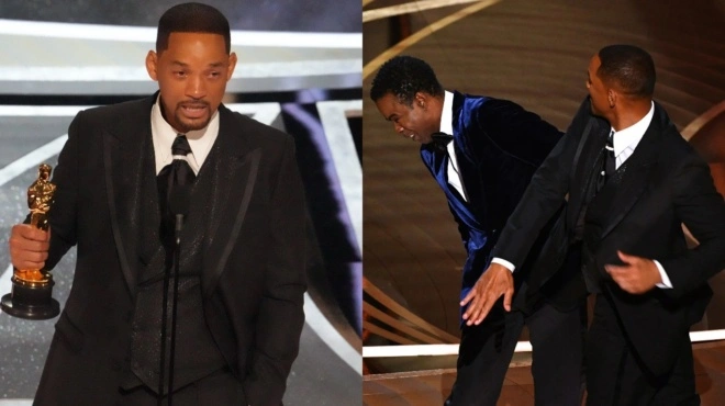 Τότε, ο Γουίλ Σμιθ ανέβηκε στην σκηνή και έδωσε ένα χαστούκι στον Κρις Ροκ, ενώ αφού επέστρεψε στην θέση του φώναξε: «Μην ξαναπιάσεις την γυναίκα μου στο γαμ…νο στόμα σου».