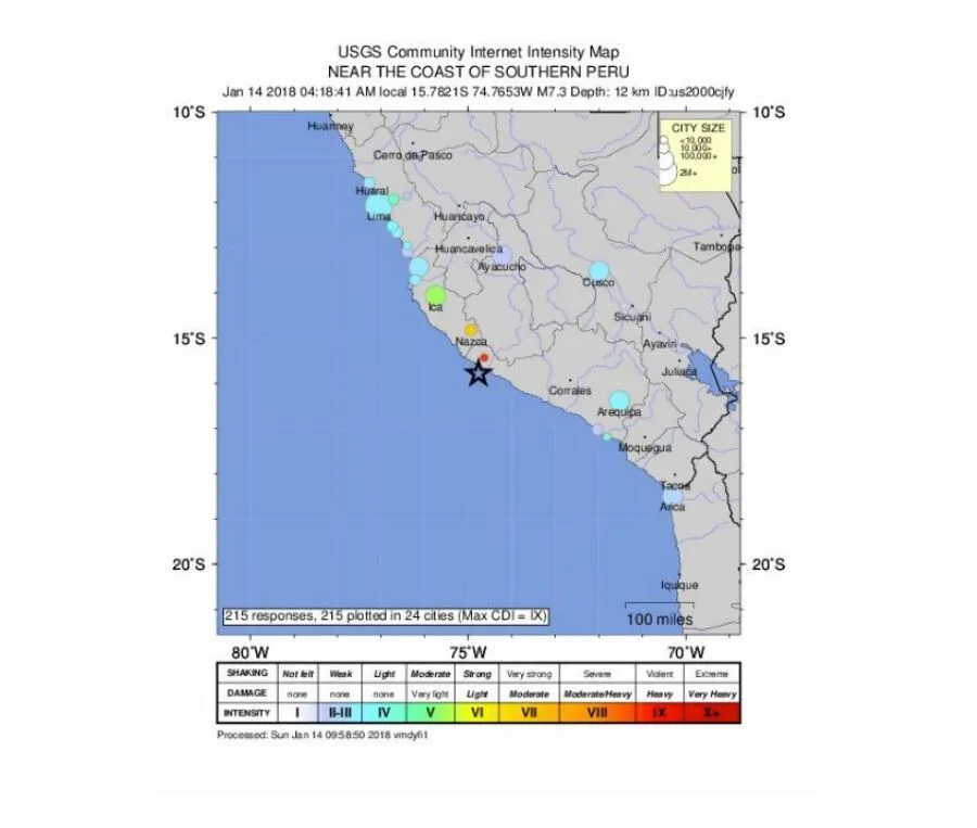 Ο σεισμός σημειώθηκε στις 11:35 τοπική ώρα (19:35 ώρα Ελλάδας), με επίκεντρο περίπου 30 χιλιόμετρα νοτιοδυτικά της παραθαλάσσιας πόλης Καγιάο, σε απόσταση μόλις 10 χιλιομέτρων από τη Λίμα, σύμφωνα με το περουβιανό Εθνικό Σεισμολογικό Κέντρο. Η δόνηση έγινε ιδιαίτερα αισθητή στην πρωτεύουσα, ενώ αναφέρθηκαν καταρρεύσεις, κατολισθήσεις και δομικές φθορές σε αρκετές περιοχές.