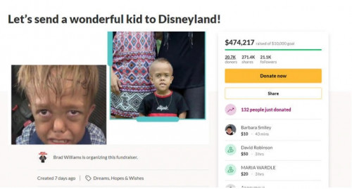 Η σχετική καμπάνια στο GoFundMe για να καταφέρει ο 9χρονος να πάει ένα ταξίδι στην Disneyland έχει ήδη συγκεντρώσει περισσότερα από 470.000 δολάρια και το ποσό αυξάνεται συνεχώς. Την πρωτοβουλία ξεκίνησε ο κωμικός Μπραντ Γουίλιαμς, που έχει την ίδια μορφή νανισμού με τον Quaden.