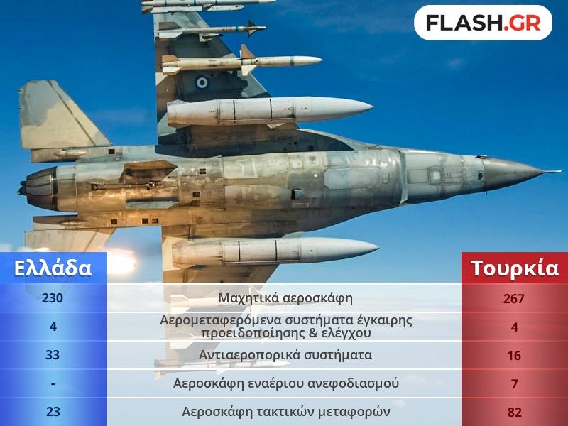 Τα Ελληνικά F-35 δεν τα αναφέρουμε, γιατί από τις δηλώσεις, μέχρι να (αν) τα δούμε να απογειώνονται κάποιοαεροδρόμιο διασποράς στο Αιγαίο, έχουμε χρόνια μπροστά μας, Η Ελλάδα συνολικά διαθέτει 230 μαχητικά, κι εκτός από τα F-16, ποιοτική διαφορά κάνουν και τα Mirage 2000-5 με το μοναδικό σε δυνατότητες οπλοστάσιο που διαθέτουν όπως οι πύραυλοι αέρος επιφανείας Exoset και αέρος εδάφους Scalp-EG ενώ δεν είναι αμελητέα (αν προς απόσυρση) τα εκσυγχρονισμένα F-4E AUP με το ρανταρ του F-18 και την τεράστια μεταφορική ικανότητά τους σε οπλικό φορτίο