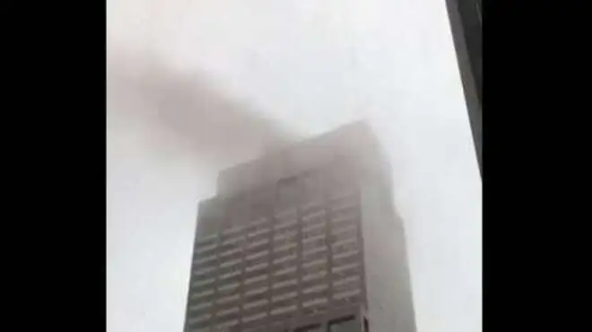 787 7th ave, #midtown NYC. We’re 1 block south. 20 mins ago there was a loud sound like a too-low #helicopter & I looked up and saw sheet of flame on roof and then smoke. News reports saying helicopter/small plane crash onto roof which would be consistent with what I heard/saw. pic.twitter.com/swY3ksLskH