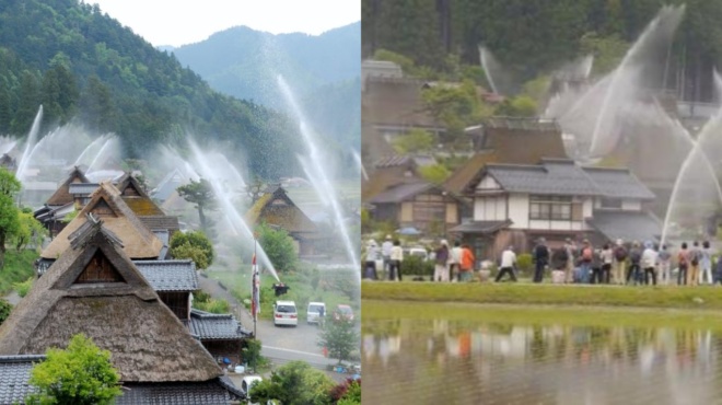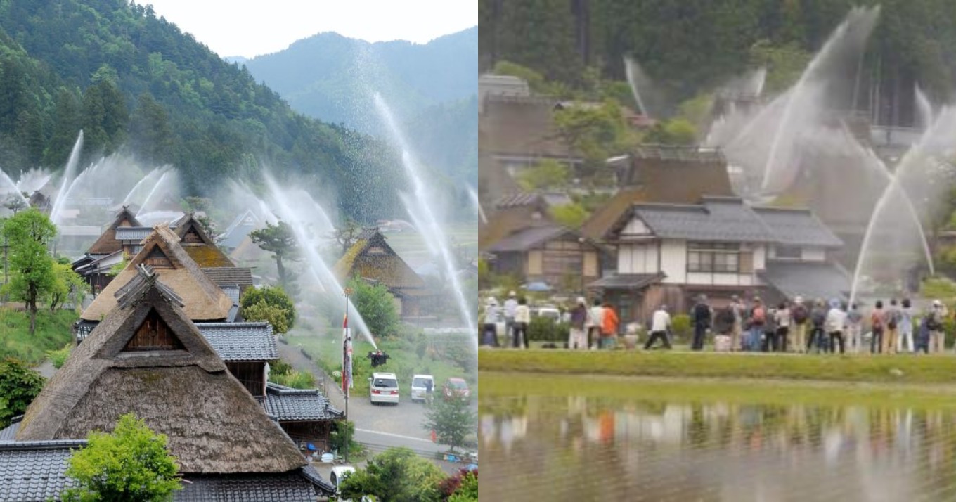 Τα συγκεκριμένα σπίτια έχουν αχυροσκεπές, που σημαίνει ότι είναι πολύ ευάλωτα σε πυρκαγιές, οι οποίες μπορούν να εξαπλωθούν αρκετά γρήγορα και να κάψουν όλο το χωριό. Το 2000 υπήρξε μια τέτοια φωτιά, η οποία έκαψε ένα κέντρο αρχειοθέτησης και τρόμαξε τους κατοίκους. Έτσι, αποφάσισαν να εγκαταστήσουν αυτό το σύστημα πυρόσβεσης.
