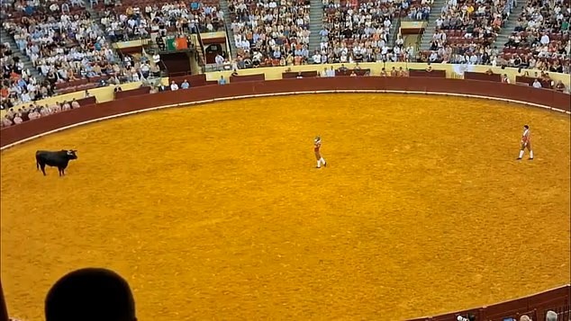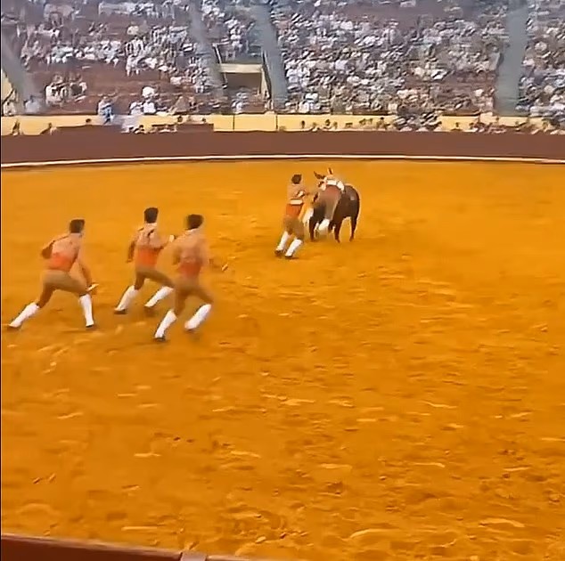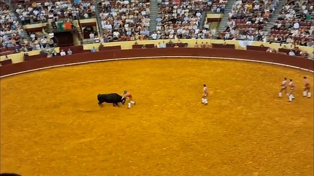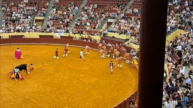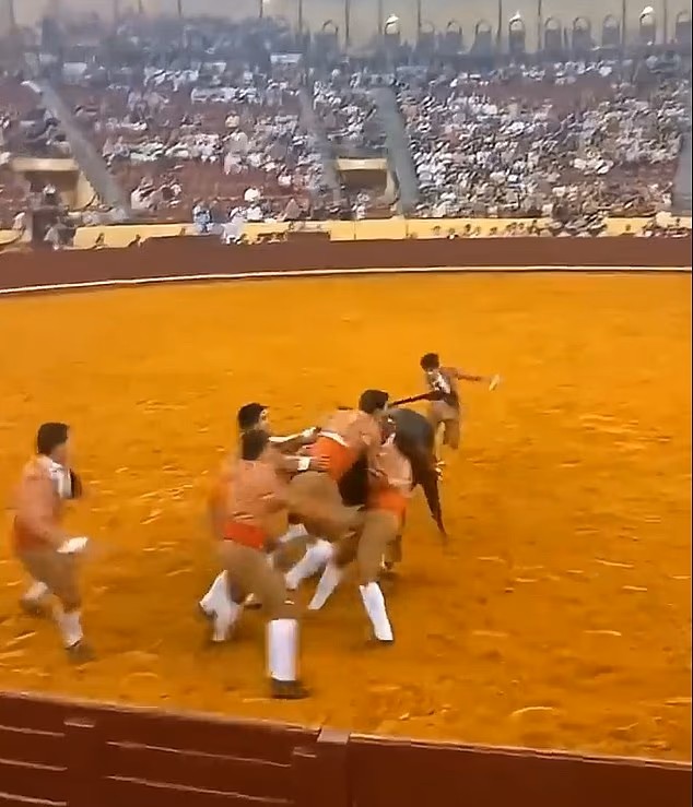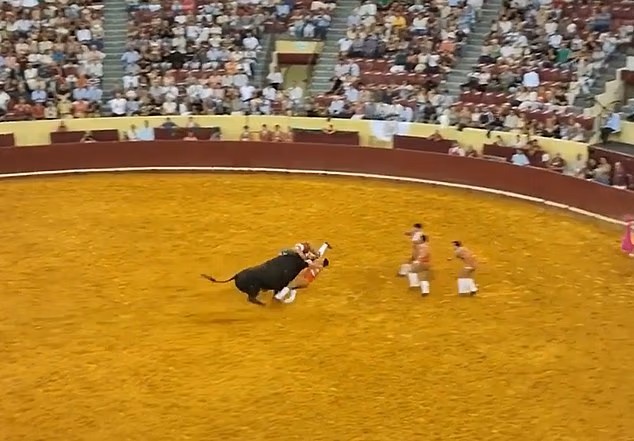 Ο ταύρος σήκωσε στον αέρα τον ταυρομάχο, παρέσυρε έναν συνάδελφό του που έσπευσε να το βοηθήσει και τελικά ακινητοποιήθηκε όταν άλλοι συνάδελφοί τους κατάφεραν να τον ηρεμήσουν.