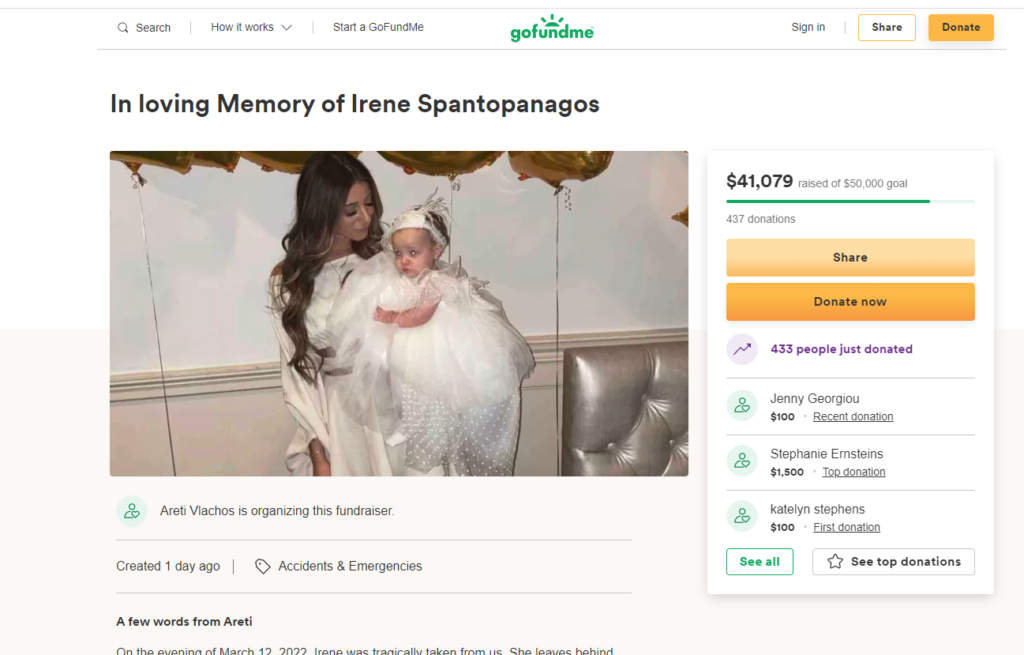 Οι συγγενείς της άτυχης Ειρήνης, άνοιξαν ερανικό λογαριασμό στον ιστότοπο www.gofundme.com και έθεσαν ως στόχο την συγκέντρωση τουλάχιστον $100.000 για την κάλυψη των εξόδων της νοσηλείας και της κηδείας της, καθώς επίσης και για την ανατροφή της μικρής της κόρης Αλέσια. Η ανταπόκριση της ομογένειας αλλά και των συγγενών από την Ελλάδα ήταν άμεση και ήδη περισσότεροι από 500 συγγενείς και φίλοι προσέφεραν μέχρι και χθες το ποσό των $50.000 περίπου.