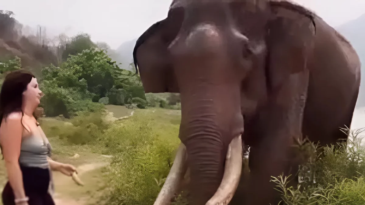 Ωστόσο, ο τεράστιος ελέφαντας δεν βρήκε διασκεδαστικό το παιχνίδι της τουρίστριας και άρχισε να εκνευρίζεται. Με μια αστραπιαία κίνηση πέταξε με τους χαυλιόδοντές του τη γυναίκα μακριά.