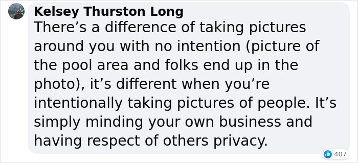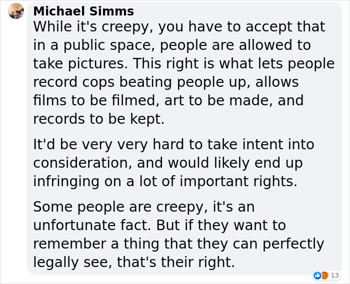 Μετάφραση: «Ενώ είναι ανατριχιαστικό, πρέπει να αποδεχτείς ότι βρίσκεται σε δημόσιο χώρο, όπου όλοι έχουν δικαίωμα να τραβούν φωτογραφίες. Αυτό είναι το δικαίωμα που επιτρέπει τους ανθρώπους να βιντεοσκοπήσουν αστυνόμους να δέρνουν απλούς πολίτες, τους επιτρέπει να γυρίζονται ταινίες, να κάνουν τέχνη και να καταγράφουν και να κρατούν αρχεία.