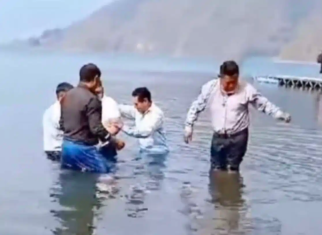 Στο βίντεο από την τελετή που έγινε στη λίμνη Ατιτλάν στη νοτιοδυτική Γουατεμάλα φαίνεται ο Μιγκέλ Σουτ να κρατάει έναν άνδρα που ετοιμαζόταν να βαπτιστεί.