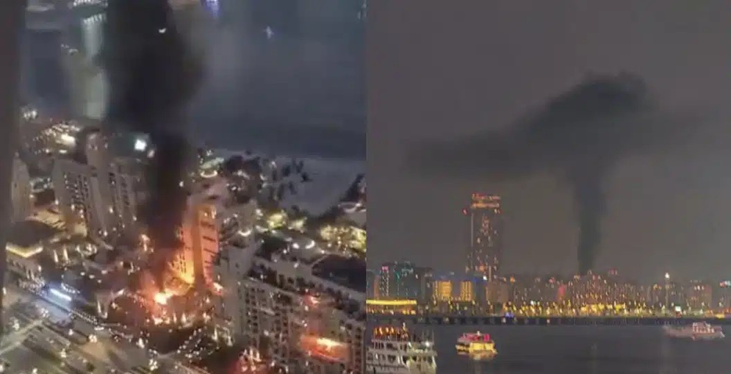 Φλόγες και καπνός φαίνονταν στο συγκρότημα ξενοδοχείων στο Palm, μία από τις πλέον τουριστικές και πολυτελείς περιοχές στο Ντουμπάι, έπειτα από επίθεση ιρανικού drone.