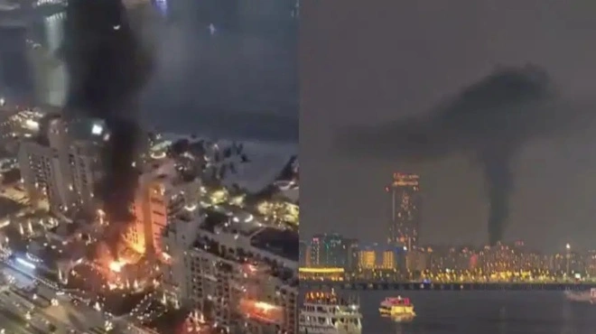 תיעוד: להבות במלון באי הדקלים בדובאי בעקבות פגיעה ישירה pic.twitter.com/iR3XtwNmJd