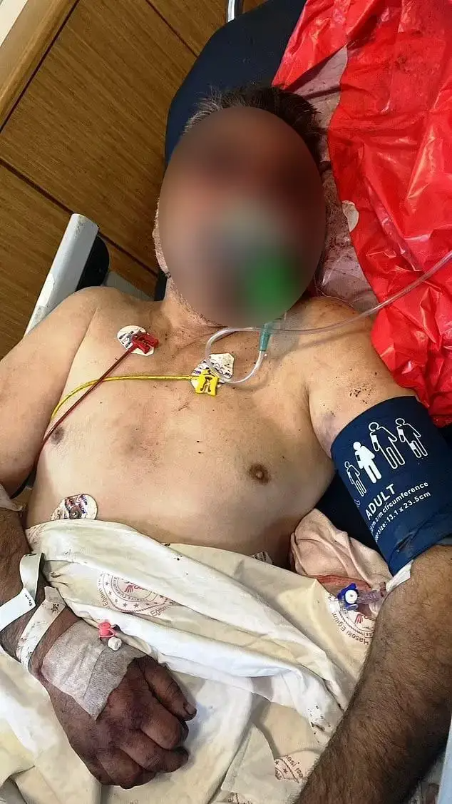 Οι φωτογραφίες του 56χρονου από το νοσοκομείο είναι συγκλονιστικές: μεταφέρεται με φορείο, τα μάτια του είναι πρησμένα και γεμάτα μώλωπες, ενώ φαίνονται και τραύματα στο δεξί του χέρι, πιθανώς από την προσπάθειά του να προστατευθεί.