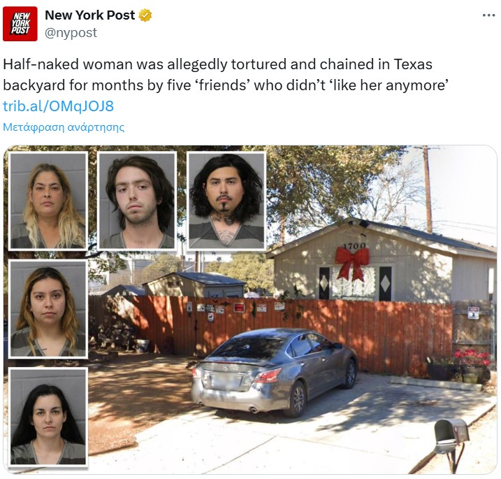 Μια σοκαριστική υπόθεση βασανιστηρίων αποκαλύφθηκε στο Ώστιν του Τέξας, όταν μια γυναίκα βρέθηκε ημίγυμνη, δεμένη με αλυσίδες σε μεταλλική κατασκευή σε αυλή σπιτιού, έχοντας υποστεί κακοποίηση για εβδομάδες. Οι αρχές συνέλαβαν πέντε άτομα που σύμφωνα με την αστυνομία ήταν «φίλοι» της γυναίκας, αλλά κάποια στιγμή αποφάσισαν ότι «δεν τη συμπαθούσαν πια».