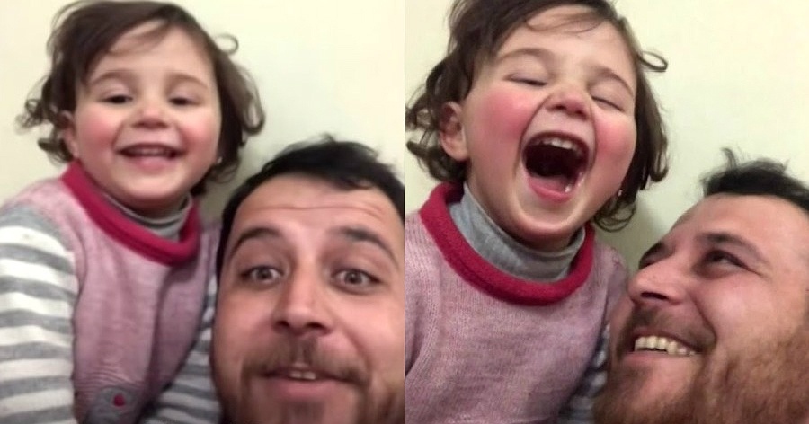 Κοριτσάκι γελά με βόμβες που πέφτουν: Ο Αμντουλάχ Μοχάμαντ έμαθε στην κόρη του να μη φοβάται. Βρήκε τον τρόπο να μετατρέπει τον τρόμο από την τρίχρονη κόρη του σε γέλιο. Ο εξαίρετος πατέρας κατάφερε να κάνει την κόρη του να γελά κάθε φορά που πέφτουν βόμβες. Συγκεκριμένα, όταν πραγματοποιείται έκρηξη από αυτές, το τρίχρονο κοριτσάκι ξεκαρδίζεται στα γέλια.