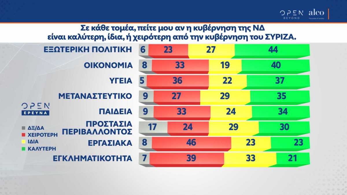 Στους ξεχωριστούς τομείς της κυβερνητικής πολιτικής οι πολίτες θεωρούν πως είναι καλύτερη η κατάσταση σε σχέση με την κυβέρνηση του ΣΥΡΙΖΑ στην εξωτερική πολιτική, στην οικονομία και στο μεταναστευτικό, ενώ μοιρασμένη είναι η κατάσταση στην υγεία και την παιδεία. Αντίθετα «καμπανάκι» χτυπούν οι απόψεις στα εργασιακά και στην εγκληματικότητα με την κυβέρνηση να καταγράφει χαμηλά ποσοστά.