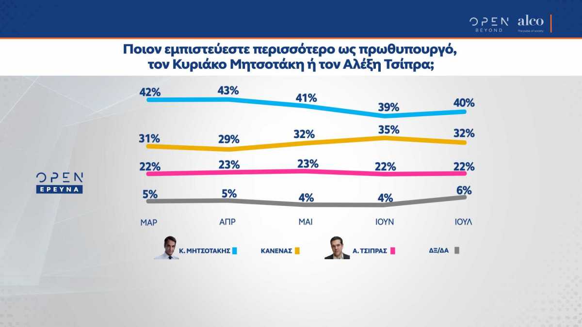 Και στο θέμα της εμπιστοσύνης ο πρωθυπουργός έχει ποσοστό 40% έναντι 22% του προέδρου της αξιωματικής αντιπολίτευσης.