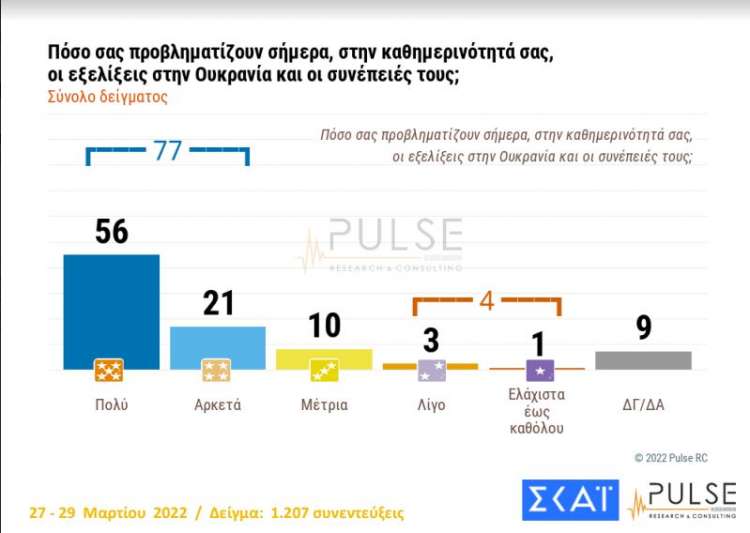 Οι πολίτες σε ποσοστό 77% δηλώνουν «πολύ» και «αρκετά» προβληματισμένοι από τις εξελίξεις στην Ουκρανία και τις συνέπειές τους. Μόνο το 4% δηλώνει από ελάχιστα έως καθόλου προβληματισμένο.