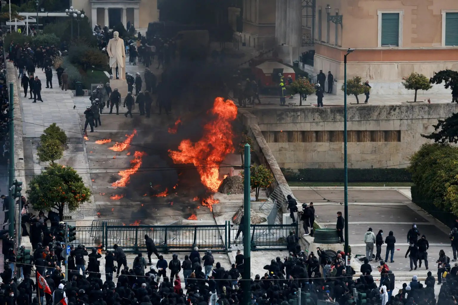Τραγικές εικόνες από το κέντρο της Αθήνας. Πλήθος διαδηλωτών παραμένει στο σημείο ενώ κουκουλοφόροι πετούν μολότοφ στο προαύλιο της Βουλής.