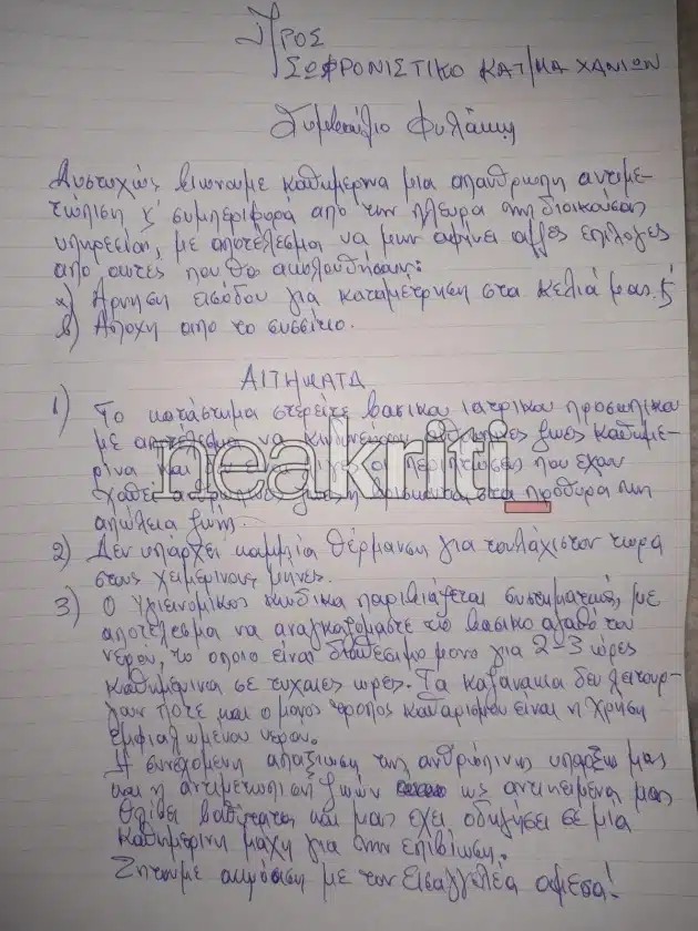 Η επιστολή των κρατούμενων προς το Σωφρονιστικό κατάστημα Χανίων: