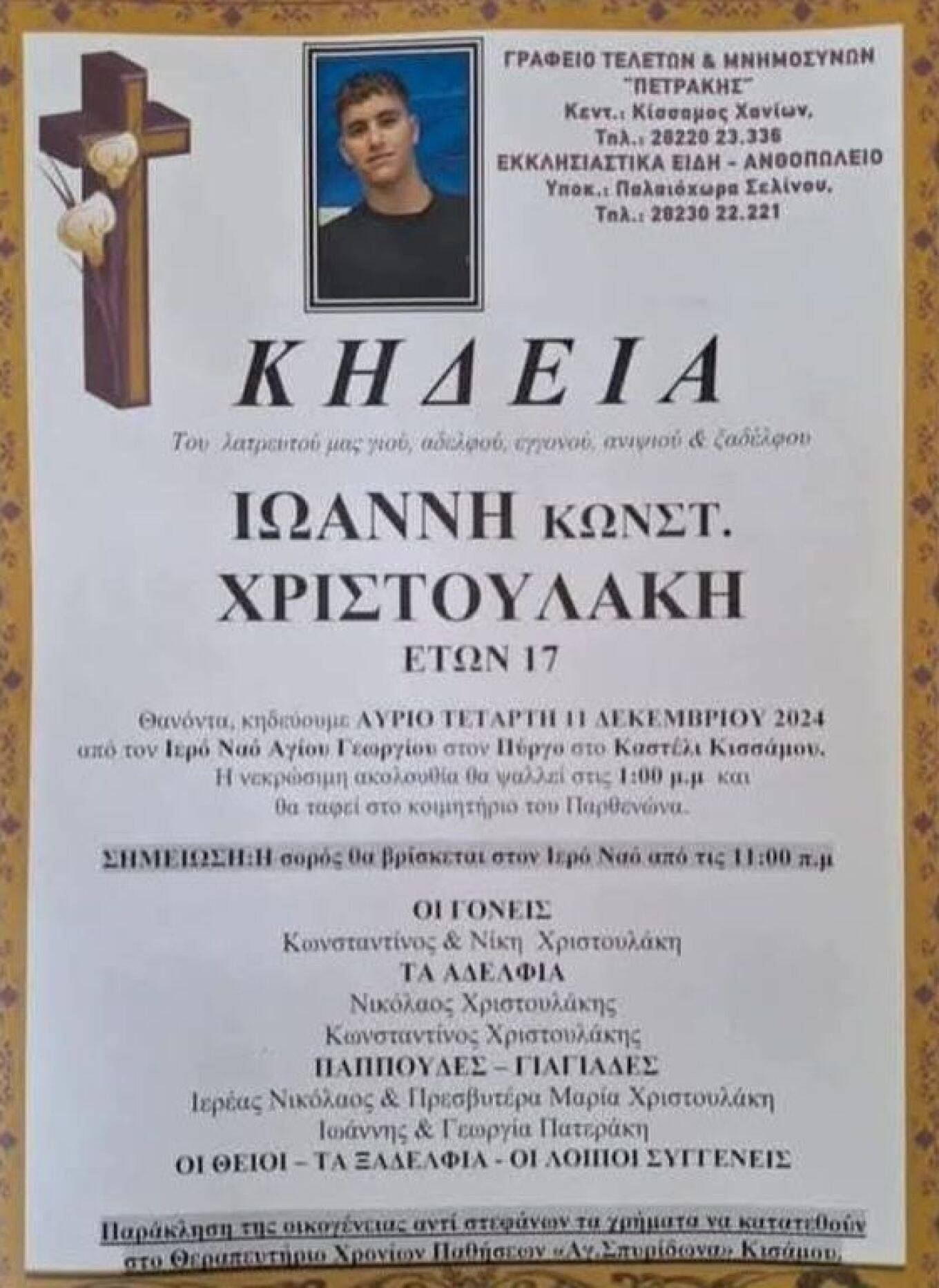Η κηδεία του 17χρονου Γιάννη θα πραγματοποιηθεί την Τετάρτη 11 Δεκεμβρίου στον Ιερό Ναό Αγίου Γεωργίου στον πύργο Καστελίου. Η σορός θα βρίσκεται στον ναό από τις 11:00 το πρωί. Παράκληση της οικογένειας, αντί στεφάνων τα χρήματα να κατατεθούν στο Θεραπευτήριο Χρονίων Παθήσεων “Αγ. Σπυρίδωνα” Κισάμου.