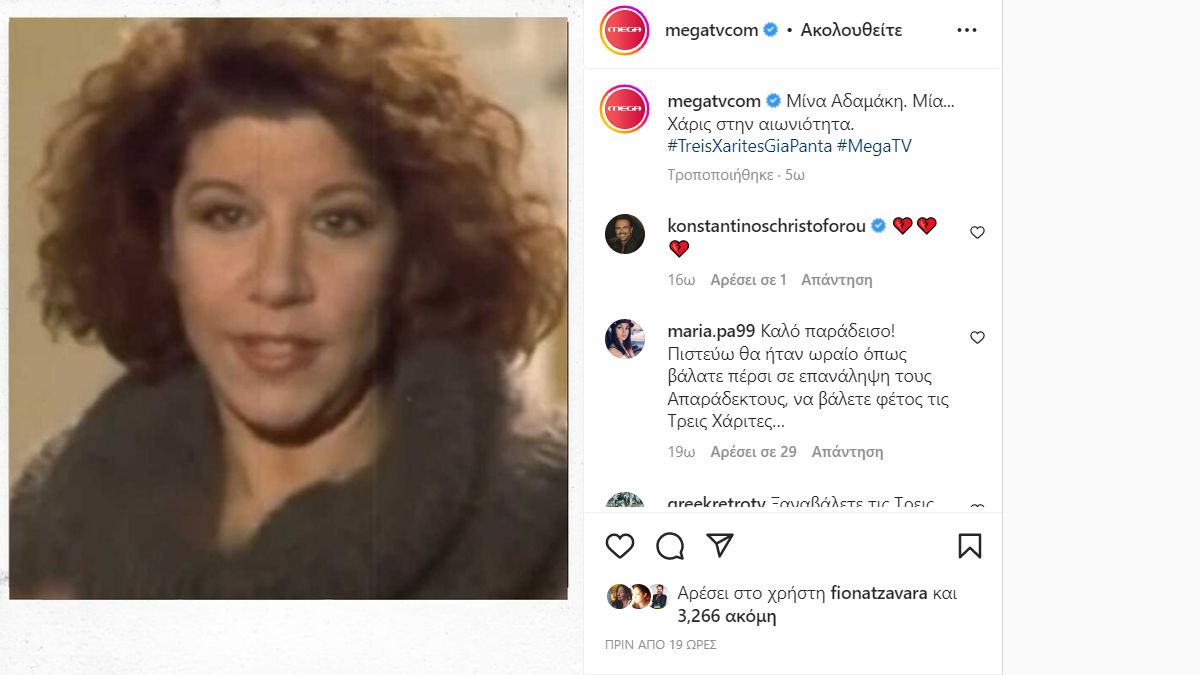 Θλίψη στον καλλιτεχνικό κόσμο προκάλεσε η απώλεια της ταλαντούχας και χαμηλών τόνων Μίνας Αδαμάκη η οποία άφησε ιστορία στη σειρά του MEGA«Οι τρεις Χάριτες».