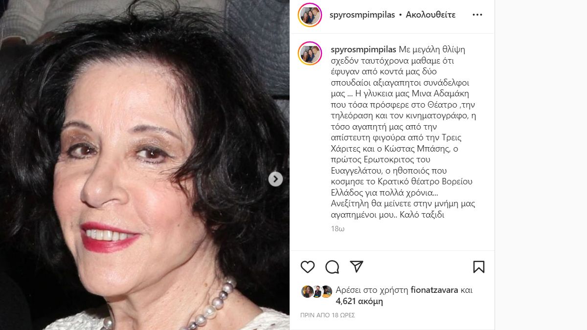 «Με μεγάλη θλίψη σχεδόν ταυτόχρονα μάθαμε ότι έφυγαν από κοντά μας δύο σπουδαίοι αξιαγάπητοι συνάδελφοι μας… Η γλυκιά μας Μίνα Αδαμάκη που τόσα πρόσφερε στο Θέατρο, την τηλεόραση και τον κινηματογράφο, η τόσο αγαπητή μας από την απίστευτη φιγούρα από την Τρεις Χάριτες και ο Κώστας Μπάσης, ο πρώτος Ερωτόκριτος του Ευαγγελάτου, ο ηθοποιός που κόσμησε το Κρατικό Θέατρο Βορείου Ελλάδος για πολλά χρόνια… Ανεξίτηλη θα μείνετε στη μνήμη μας αγαπημένοι μου.. Καλό ταξίδι».