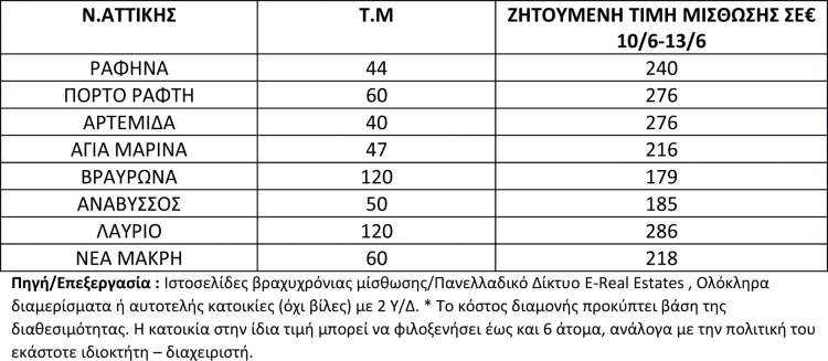 Συγκεκριμένα, στη Ραφήνα κατοικία 44 τμ μισθώνεται προς 240€ για το τριήμερο, στο Πόρτο Ράφτη κατοικία 60τμ προς 276€, στην Αρτέμιδα κατοικία 40τμ προς 276€, στην Αγία Μαρίνα κατοικία 47τμ προς 216€, στην Ανάβυσσο κατοικία 50τμ προς 185€, στη Νέα Μάκρη κατοικία 60τμ προς 218€.