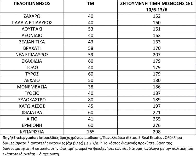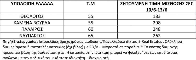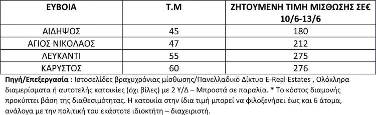 Στην Αιδηψό κατοικία 45τμ μισθώνεται προς 187€, στον Άγιο Νικόλαο κατοικία 47τμ προς 212€, στο Λευκαντί κατοικία 55τμ προς 275€ και στη Κάρυστο, κατοικία 60τμ μισθώνεται προς 276€ για τρεις διανυκτερεύσεις.