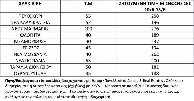Οι κάτοικοι της Θεσσαλονίκης, μπορούν να επιλέξουν προορισμούς στη Χαλκιδική σε απόσταση χιλιομετρική από 60χιλ έως 90χιλ όπως, τη Νέα Ποτιδαία και τα Νέα Μουδανιά .Στα Νέα Μουδανία κατοικία 40τμ μισθώνεται προς 262€ και στη Νέα Ποτιδαία κατοικία 55τμ προς 200€.
