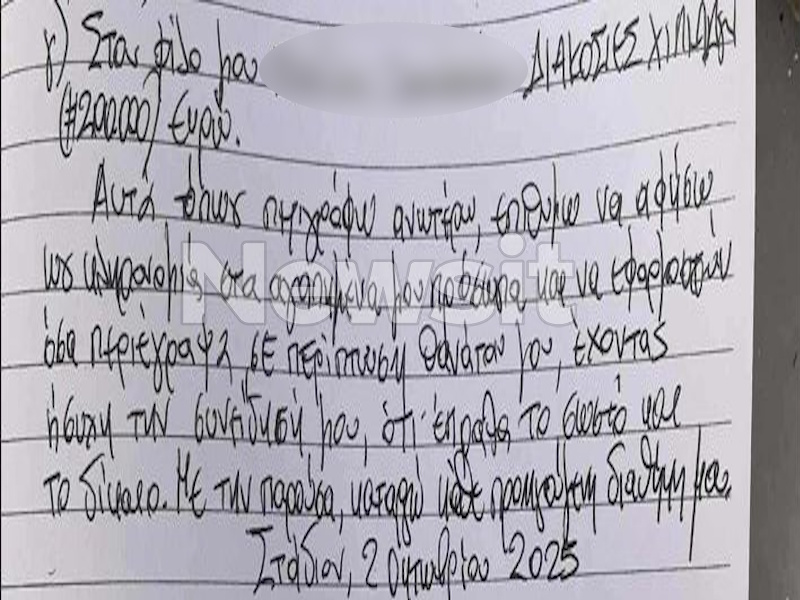 «Σήμερα, στις 2 Οκτωβρίου 2025, κάθομαι και γράφω την διαθήκη μου (σε περίπτωση αιφνιδίου θανάτου μου) και σύμφωνα με την επιθυμία μου, θα είναι η εξής», αναφέρει ο 68χρονος στην αρχή της διαθήκης του, πριν προχωρήσει στην κατανομή της περιουσίας του.