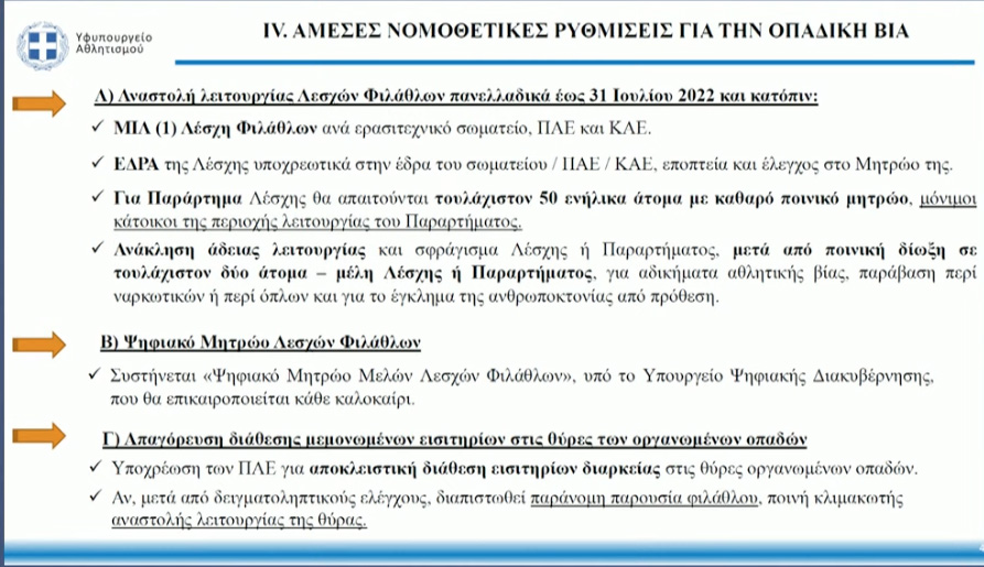 - Το Υπουργείο Ψηφιακής Διακυβέρνησης δημιουργεί ψηφιακή πλατφόρμα, με τίτλο «Ψηφιακό Μητρώο Μελών Λεσχών Φιλάθλων», που θα επικαιροποιείται κάθε καλοκαίρι, με ευθύνη των υπευθύνων των Λεσχών.