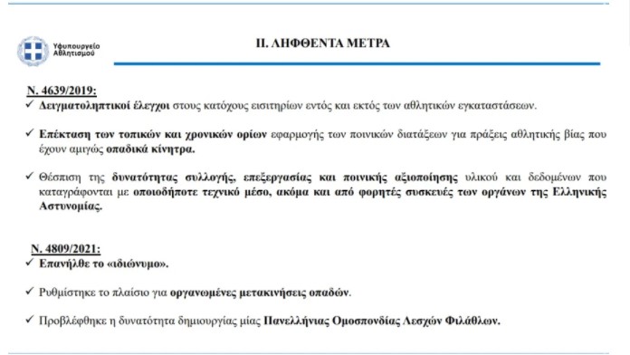 - Δημιουργείται, μεταξύ άλλων, το Εθνικό Κέντρο Πληροφοριών Ποδοσφαίρου εντός των δομών της Ελληνικής Αστυνομίας, που θα έχει να κάνει ΚΑΙ με ανταλλαγή πληροφοριών διεθνούς συνεργασίας.