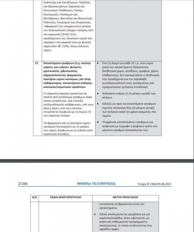 Αναλυτικότερα, όπως αναφέρει η απόφαση στα καταστήματα τροφίμων πχ στα σούπερ μάρκετ θα μπορεί να εισέρχεται 1 άτομο για κάθε 25 τ.μ στον κύριο χώρο του καταστήματος. Χωρίς ωστόσο, να προσμετράται ο πληθυσμός που προσέρχεται για την παραλαβή αυτοδιαγνωστικού τεστ. Ανεξάρτητα από το αν πραγματοποιείται συναλλαγή.