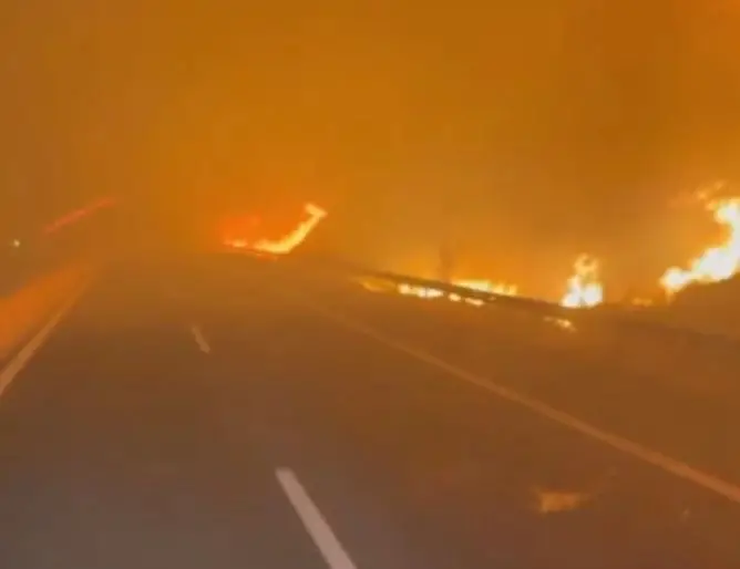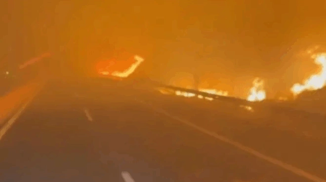 Σε βίντεο που ανάρτησε το MeteoHellas στα κοινωνικά δίκτυα, φαίνεται οδηγός να περνά μέσα από «διαδρόμους» φωτιάς, με τις φλόγες να αγγίζουν σχεδόν το οδόστρωμα. Η ατμόσφαιρα είναι αποπνικτική, με τον πυκνό καπνό να περιορίζει την ορατότητα και να καλύπτει κάθε σημείο γύρω από το δρόμο.